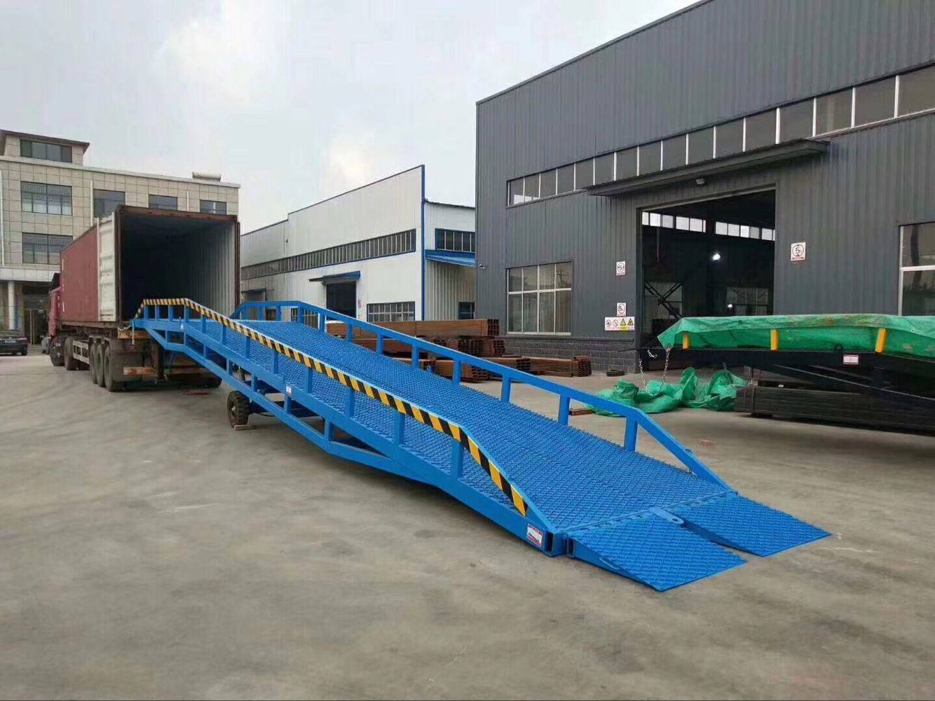移動式登車橋是固定式登車橋的姊妹產(chǎn)品,它主要應(yīng)用在車站、碼頭、工廠倉庫等貨運量大,但又不方便做貨臺的場所,能夠在地面和運輸車輛之間搭起一座橋,使叉車使得地行駛,達到裝卸貨目的,該設(shè)備一端與地面接觸,另一端搭接在車廂后緣上,并能根據(jù)不同車型及裝車過程中車廂的變化,自動調(diào)整高度,從而大大提高工作效率。主體部分采用矩形管焊接而成,強度高,承載能力大;液壓系統(tǒng)采用進口手壓泵,安全耐用;橋面采用高強度鋼板網(wǎng),增加了磨擦系數(shù),便于叉車的行駛,減輕了橋體的自身重量,使移動更加靈活。